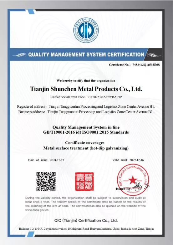 শুনচেনের সিনিয়র ম্যানেজমেন্টের হট-ডিপ গ্যালভানাইজিং উত্পাদনে 20 বছরেরও বেশি অভিজ্ঞতা এবং প্রযুক্তি রয়েছে।