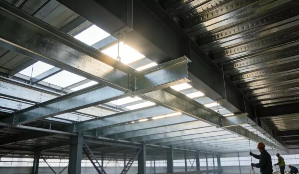 বিল্ডিং ম্যাটেরিয়ালস ইন্ডাস্ট্রি: স্টিল স্ট্রাকচার ওয়ার্কশপের জন্য পুরলিন এবং রুফ জোস্ট ইনস্টলেশনের পরিস্থিতি