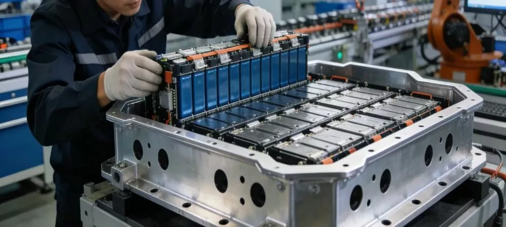 পরিবহন সেক্টর: নতুন এনার্জি ভেহিকেল ব্যাটারি প্যাক ফ্রেম সমাবেশের ক্লোজ-আপ