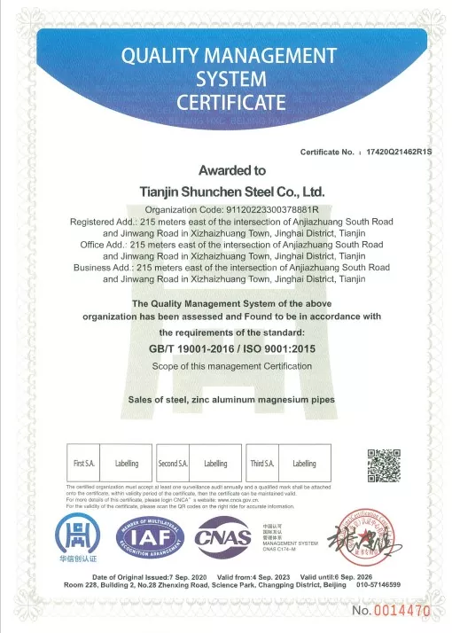 মান: GB/T 3091-2015 "নিম্ন-চাপের তরল পরিবহনের জন্য ঢালাই ইস্পাত পাইপ", GB/T 13912-2020 "হট-ডিপ গ্যালভানাইজড স্টিল টিউব"। পণ্যটি তৃতীয় পক্ষের পরীক্ষায় উত্তীর্ণ হয়েছে এবং একটি পরীক্ষার প্রতিবেদন রয়েছে।