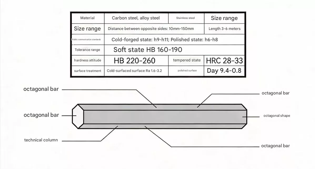 এটি স্ট্যান্ডার্ড রেগুলার অষ্টভুজাকার স্টিলের থেকে আলাদা, এটি একটি অষ্টভুজাকার ক্রস-সেকশন সহ একটি কাস্টমাইজ করা কঠিন ধাতব প্রোফাইল এবং একটি অসমম্যাট্রিক কাঠামো, যেমন ফ্ল্যাট অষ্টভুজ, উদ্ভট অষ্টভুজ, বা কী স্লট, তেল স্লট এবং পজিশনিং ফ্ল্যাটের মতো কার্যকরী বৈশিষ্ট্য।